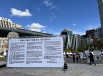 서울광장에서 메시지 배너를 들고 사진을 찍는 북한인권 활동가들