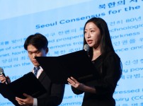 폐회식 및 북한인권 서울 컨센서스 발표 발표하는 주성은 대변인(우), 김일혁 부대변인(좌)