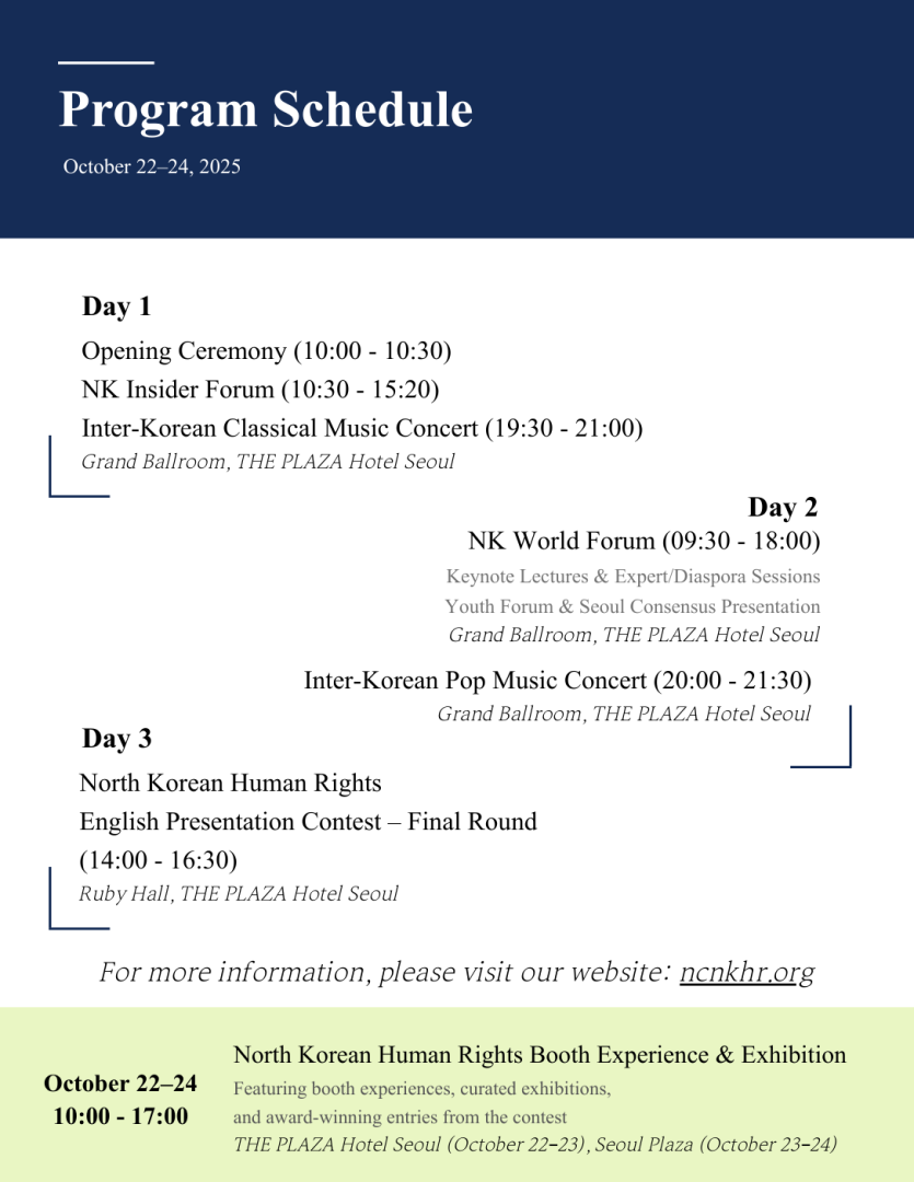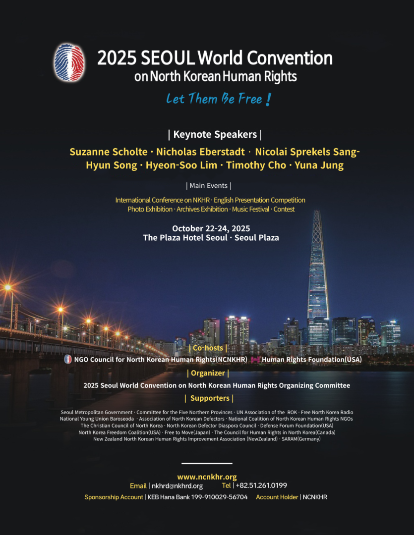 We are pleased to invite you to participate in the 2025 Seoul World Convention on North Korean Human Rights, the largest-ever international gathering on this critical issue. The Convention will bring together distinguished experts from Korea and abroad, along with members of the North Korean defector diaspora from more than 30 countries.