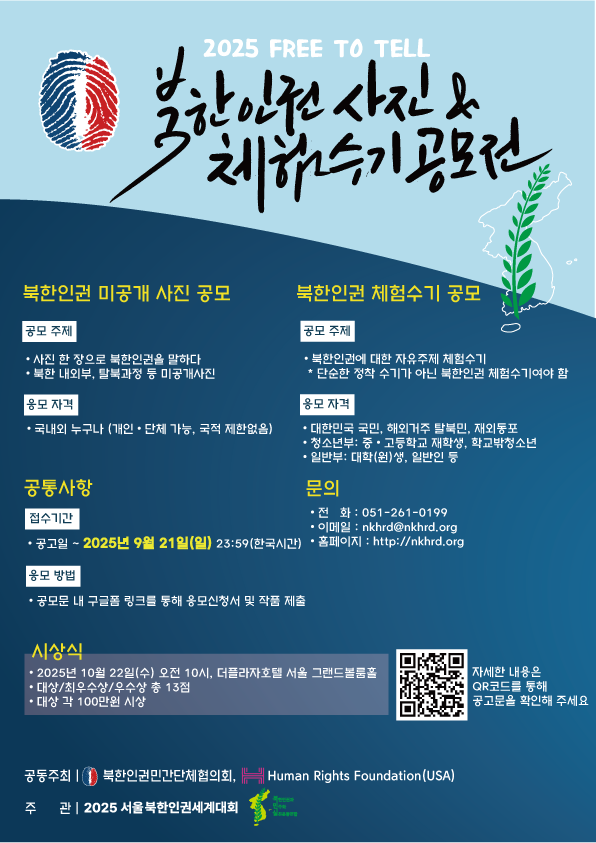 2025 Free to Tell - 북한인권 사진 및 수기 공모전(접수마감) 페이지 정보 작성자 담당자 댓글 0건 조회 20회 작성일 25-09-28 17:44 목록 본문 2025 Free to Tell - 북한인권 사진 및 수기 공모전 접수가 마감되었습니다. 응모해주신 모든 분들께 감사드립니다:) 이전글2025 Free to Tell – NKHR Photo & Essay Contest (Closed for Submissions) 25.09.28 댓글 0 댓글목록 등록된 댓글이 없습니다.