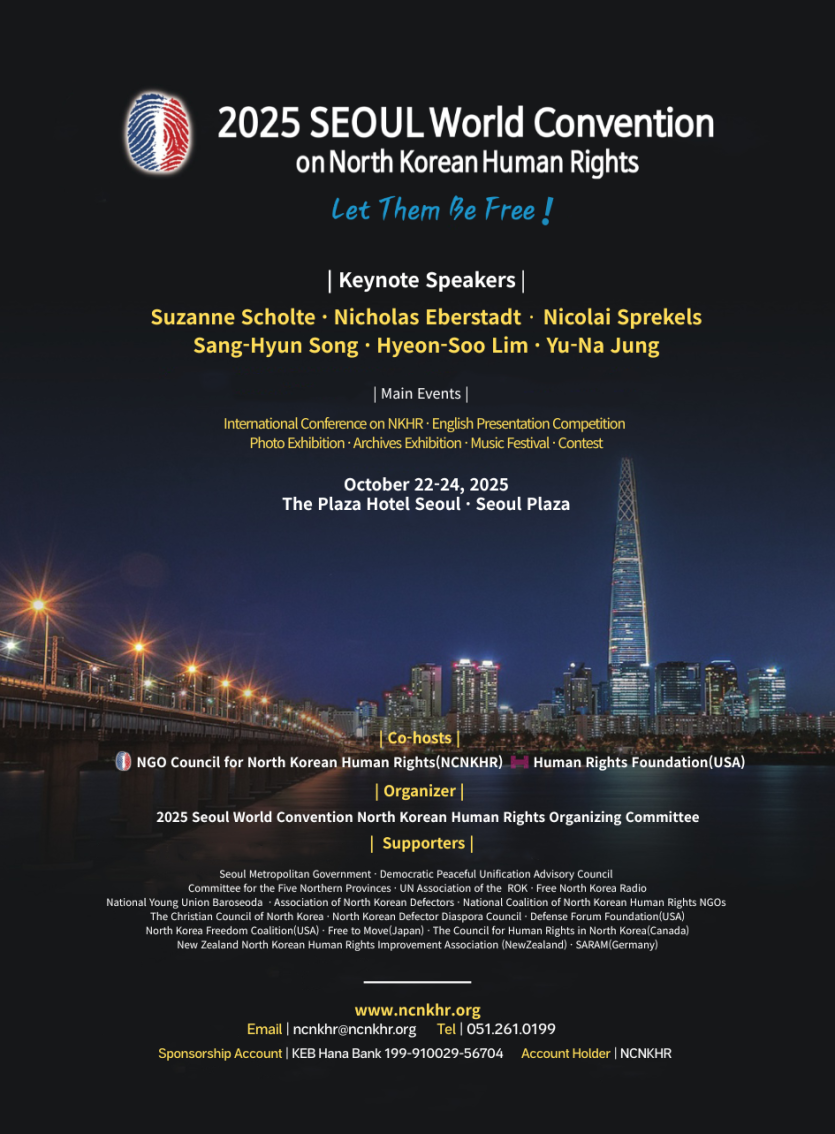 We are pleased to invite you to participate in the 2025 Seoul World Convention on North Korean Human Rights, the largest-ever international gathering on this critical issue. The Convention will bring together distinguished experts from Korea and abroad, along with members of the North Korean defector diaspora from more than 30 countries.